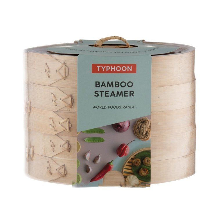 The Typhoon World Foods Bamboo steamer is crafted from natural bamboo and is perfect for cooking, heating and serving vegetables, seafood, meats and rice. | The steamer includes 2-tiers and cooks food gently, locking in flavour as well as nutrients. | Easy to use, simply layer up food in the 2 tiers, then place over a wok of simmering water. | The steamer can be placed straight onto the table, so you can impress guests with Authentic Asian recipes. | The Typhoon World Foods collection includes cook and serveware for those who love to cook or serve dishes from around the globe.