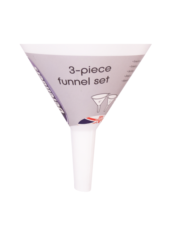 Funnel dry goods or liquids accurately and without spills. | Choice of 3 sizes for optimal fill rates. Use hang holes or nest together for easy storage. | Translucent – easy to clean