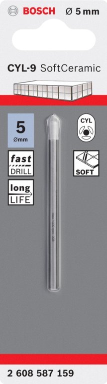 The CYL-9 SoftCeramic Tile Drill Bit is the standard choice when drilling in tiles. Dry drilling without lubrication is possible, which makes working with this bit effortless and convenient. Additionally, it has a simple flute-less design, which is especially suitable for drilling through soft-to-medium hard tiles. Drill without impact at low speeds. The bit is compatible with corded or cordless non-impact drills with a cylindrical shank system.