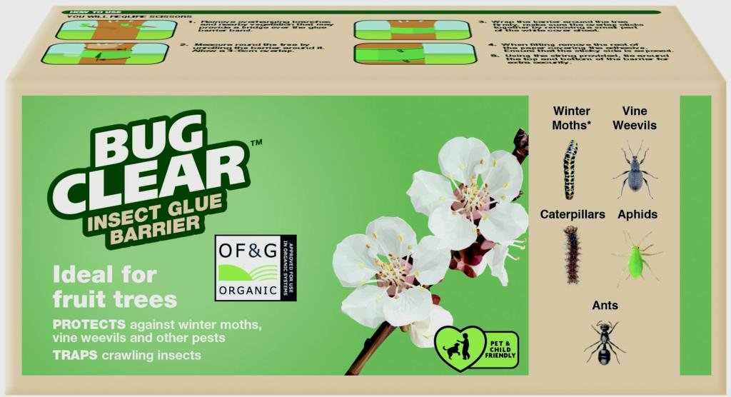 BugClear Insect Glue Barrier is ideal for fruit trees, as it protects against winter moths laying their eggs, vine weevil and other pests. Ideal for use from the end of October until April. Made out of natural glue, its length of 5m is a strong natural barrier and safe for pets, children and wildlife. Pesticide-free, this product is child and pet friendly and is certified for use in organic gardening. The box is made of 100% recycled material and can be recycled.