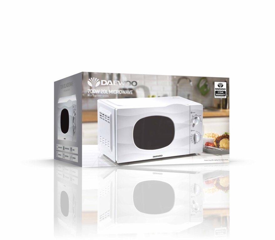 Large 20L capacity | 700W – fast & powerful | 5 power levels including defrost function | Textured ‘wave’ design | 35 minute timer | 3 year extended warranty (online registration) | Dimensions: 24.6H x 44.4W x 33.6D cm | Weight: 11kg