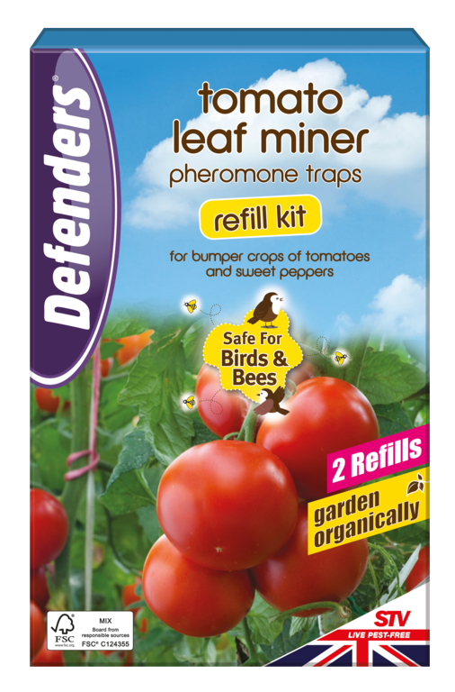 For use in Defenders Tomato Leaf Miner Trap only. | Easy set-up with effective disruption and control of adult breeding cycles using species-specific pheromone lure. | Protective see-through cover keeps birds, bees, and non-target species of wildlife and pollinating insect free from harm. | Moisture and UV light-resistant, twinpack traps are refillable for season-long use. | 100% Recycled backing board.